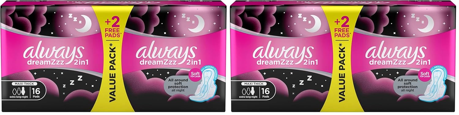 Always Dreamzzz 2in1, Feather Soft, Maxi Thick, Extra Long Sanitary Pads with Wings, 16 Pads (Pack of 2)