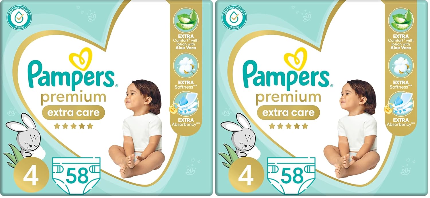 Pampers Premium EXTRA CARE Taped Diapers, Size 4, 9-18 kg, with Lotion with Aloe Vera, 58 Baby Diapers (Pack of 2)