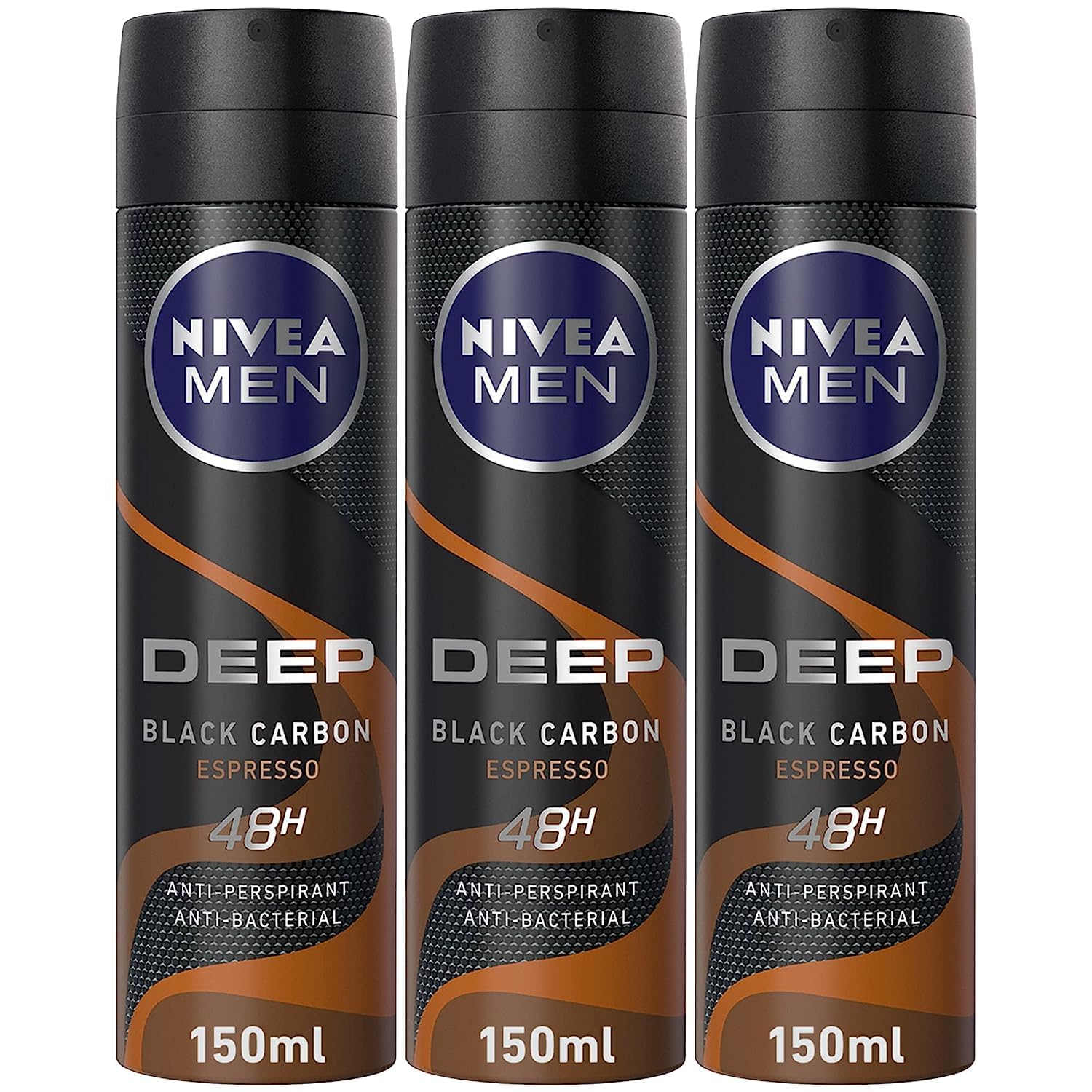 NIVEA MEN Antiperspirant Spray for Men, 48h Protection, DEEP Black Carbon Antibacterial, Espresso Scent, 3x150ml