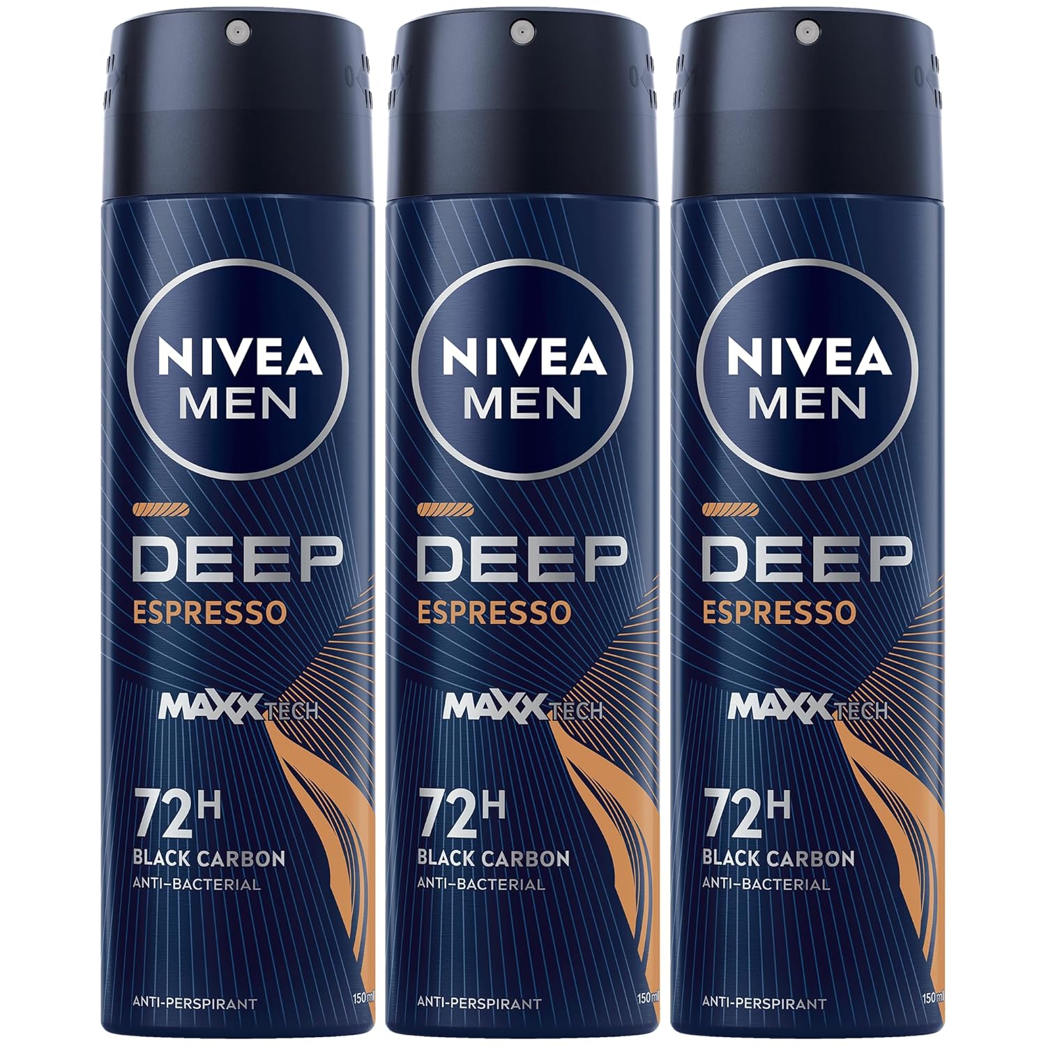 NIVEA MEN Antiperspirant Spray for Men, Antibacterial DEEP Black Carbon Espresso, 3x150ml
