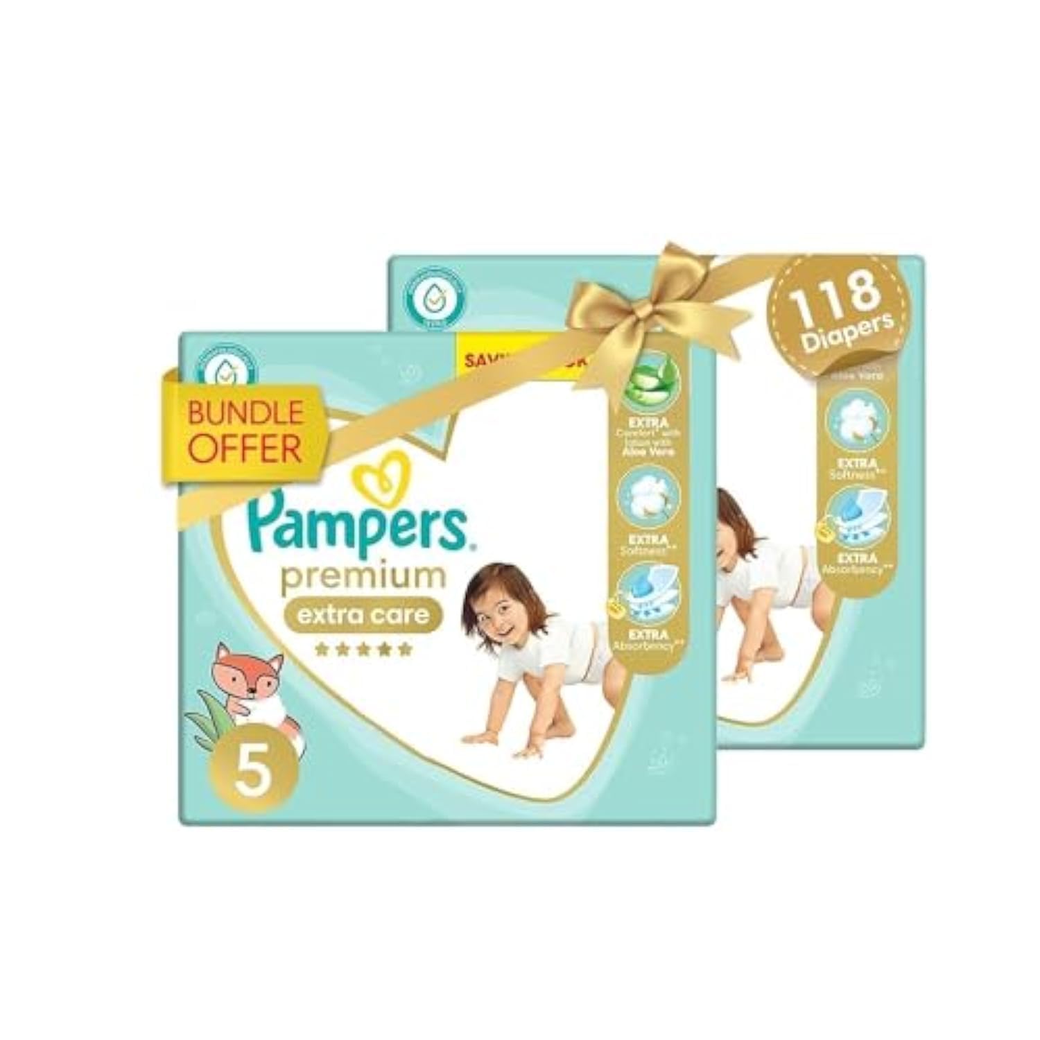 Pampers Premium Extra Care Diapers, Size 5, 11-25 kg, with lotion with aloe vera 118 Baby Diapers Bundle of 2
